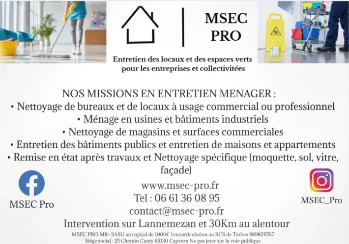 MSEC PRO, votre partenaire de confiance pour l'entretien des parties communes à Pau, est à votre écoute pour répondre à tous vos besoins en matière de nettoyage et d'entretien. Que vous soyez propriétaire, copropriétaire ou une agence immobilière, notre équipe est prête à vous offrir un devis gratuit et personnalisé. Basée à Lannemezan, notre entreprise s'engage à fournir des prestations régulières et fiables grâce à nos agents de nettoyage qualifiés et formés.