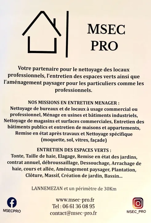 Dans un monde où le temps est une ressource précieuse, MSEC PRO se positionne comme le partenaire idéal pour l'entretien global de vos locaux et espaces extérieurs à Tarbes et ses environs. Avec plus de 18 ans d'expérience, cette entreprise de service d'entretien ménager et paysager offre une solution complète pour les entreprises et les particuliers. Basée à Lannemezan, MSEC PRO s'engage à fournir des services de haute qualité, alliant expertise en ménage professionnel et aménagement paysager.